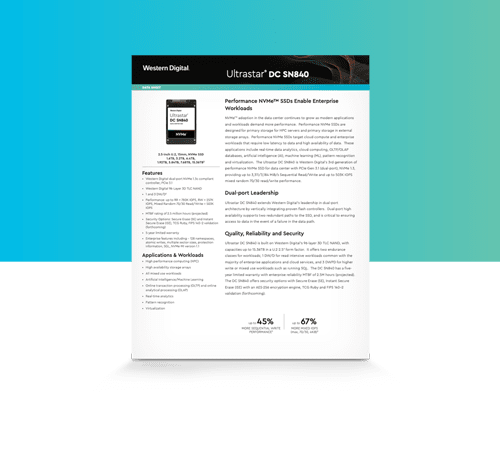 Ultrastar DC SN840 NVMe SSDs are the ideal NVMe solution that meets the demands of high-performance computing (HPC) servers and mission-critical applications such as cloud computing, OLTP/OLAP database, data analytics, AI/ML and virtualization—all of which require superior read/write performance, low latency and dual-port high availability.