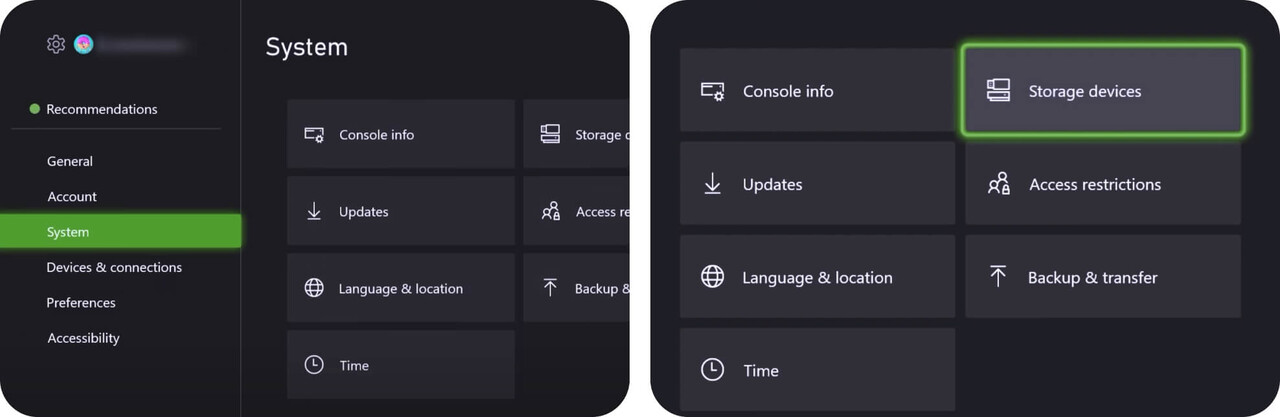 Go to Settings, then System, then Manage Storage devices. Choose Internal storage and choose Move or copy. Select the games you want to offload and then click Move selected. Confirm by selecting Move and then let it run.