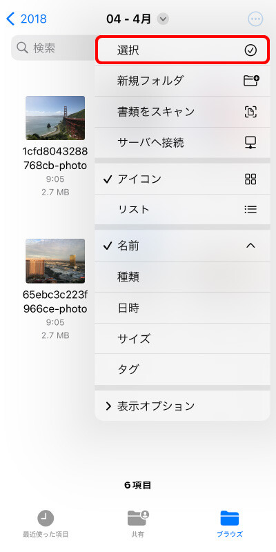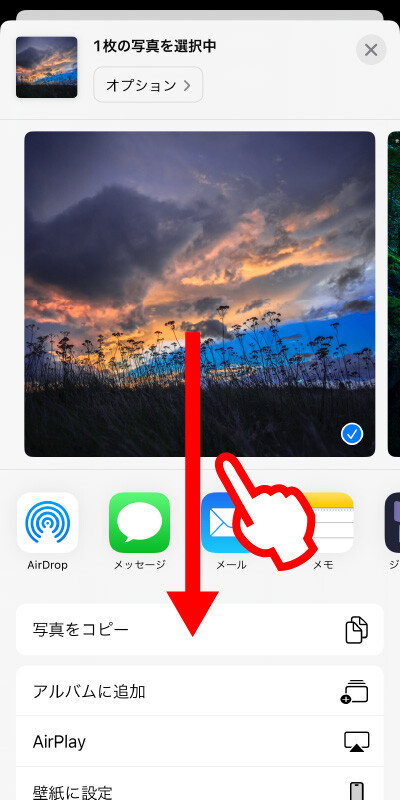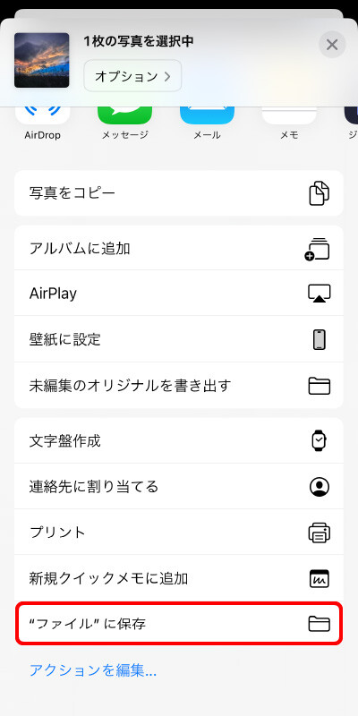 表示させたメニューを下にスクロールすると、「ファイルに保存」が表示されます。これを選択すると、ファイルアプリ