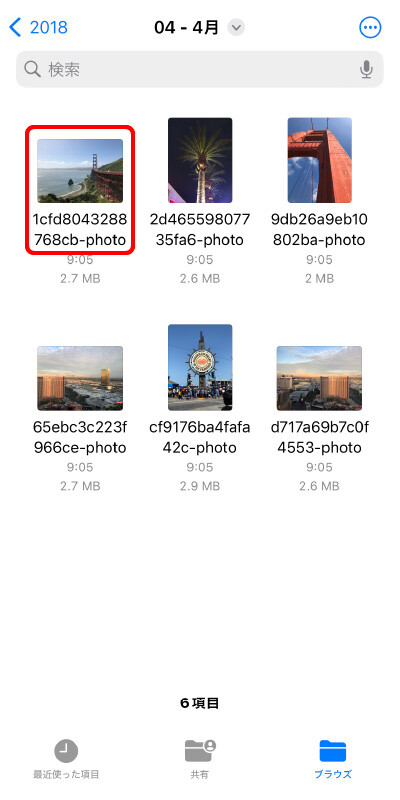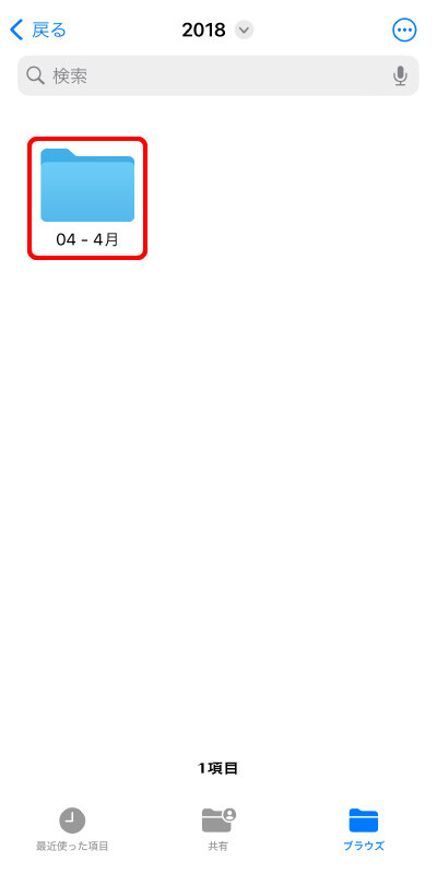 写真は撮影(保存)日ごとに年・月のフォルダに分かれて保存されていました。ここでは、2018年4月の写真を表示させたいので、2018(年)のフォルダをタップします。次に4月をタップしますと写真・動画が表示されます。(ご使用の環境によって、保存されている場所は異なります。)