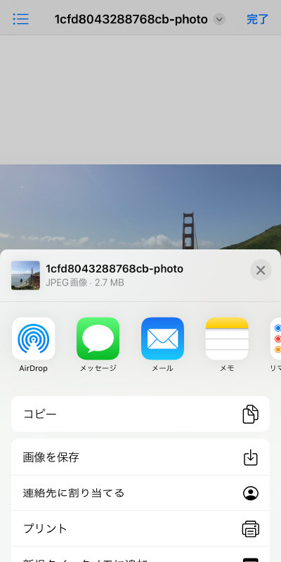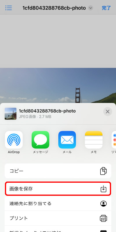 をタップし、次に「画像を保存」をタップするとiPhoneの写真アプリ